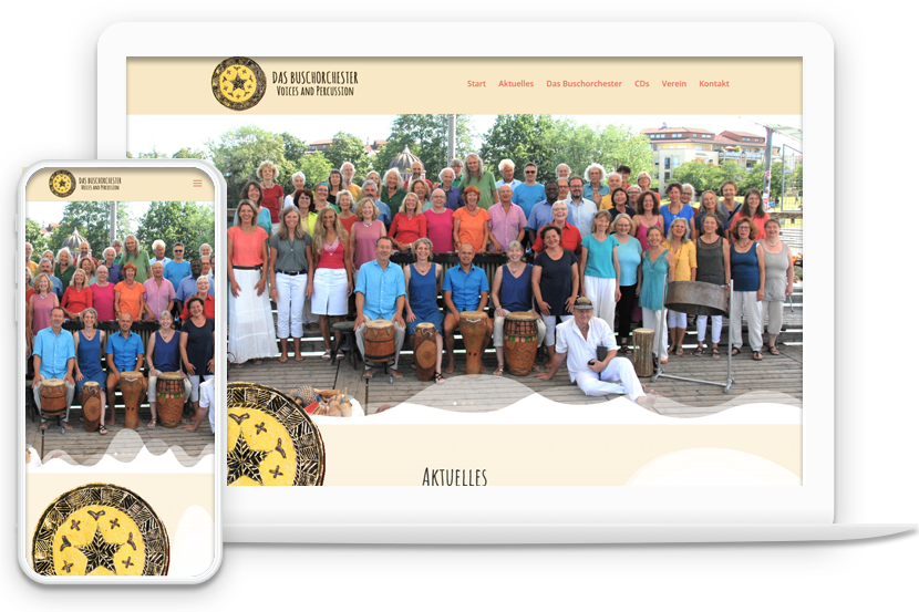 DAS BUSCHORCHESTER gibt es schon seit 1990 und die erste Webseite war auch schon von mir, noch reines html/css und ein bisschen Javascript. Von 1995 bis 2009 habe ich mit viel Freude mit getrommelt, musiziert und gesungen und so war es klar, dass ich auch den modernen Onepager mit Insiderwissen gestalten konnte.